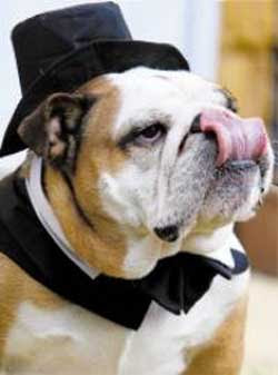 A bulldog standing up, leaning against a doorway, with a black tophat, and a necklace around its neck.